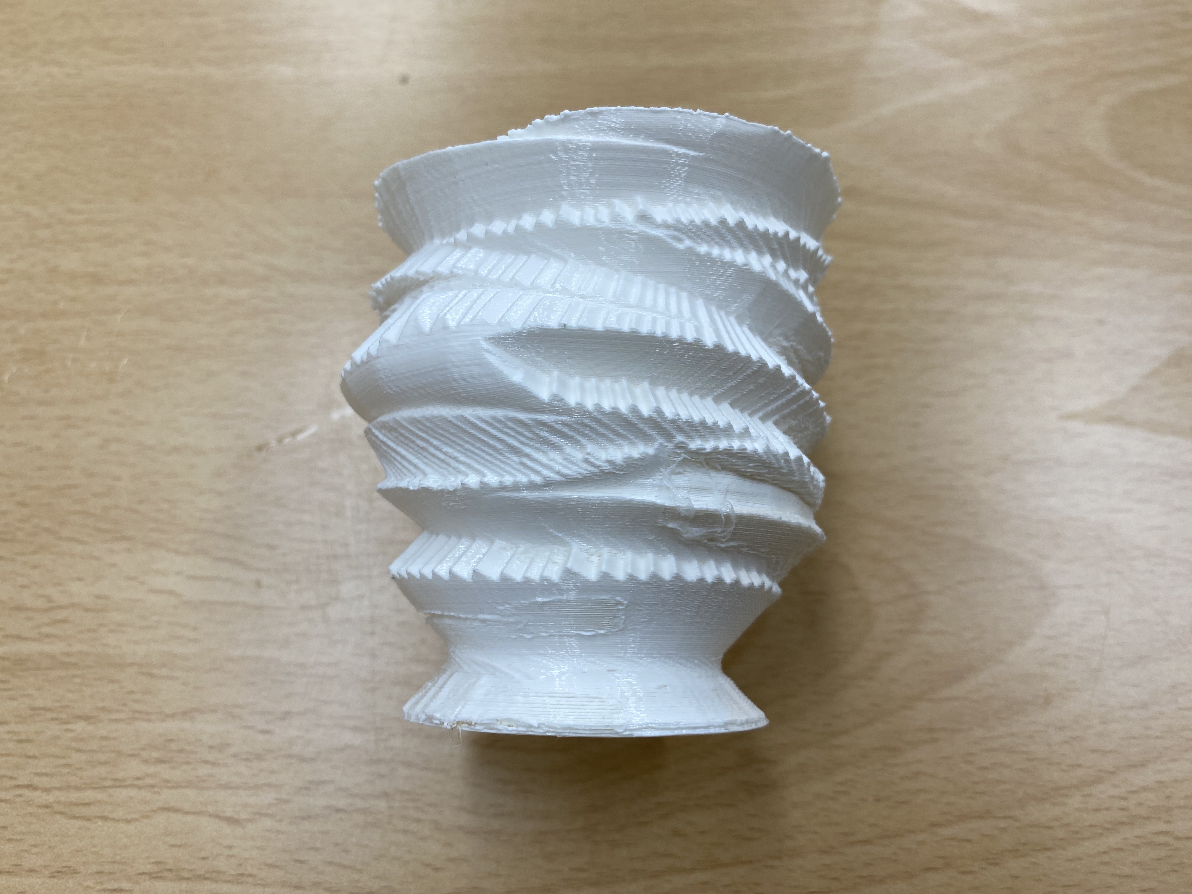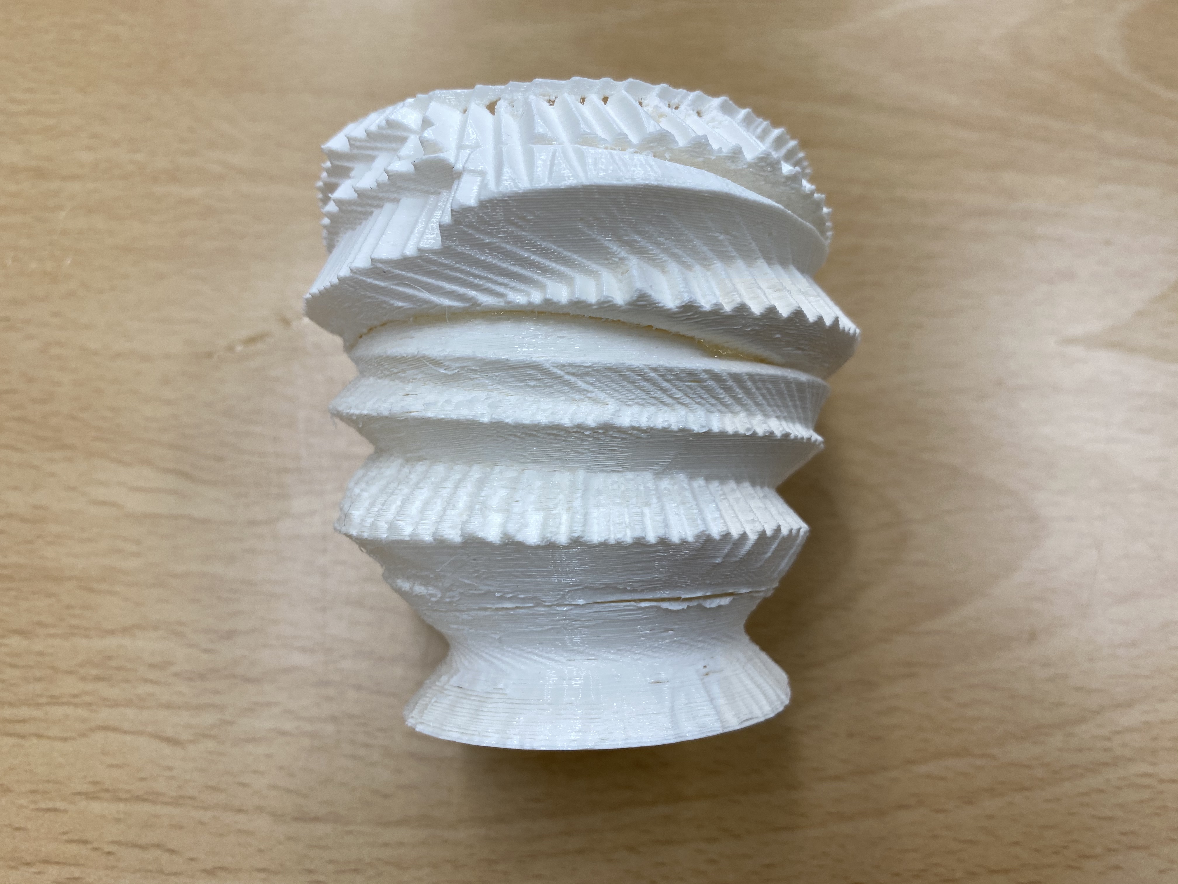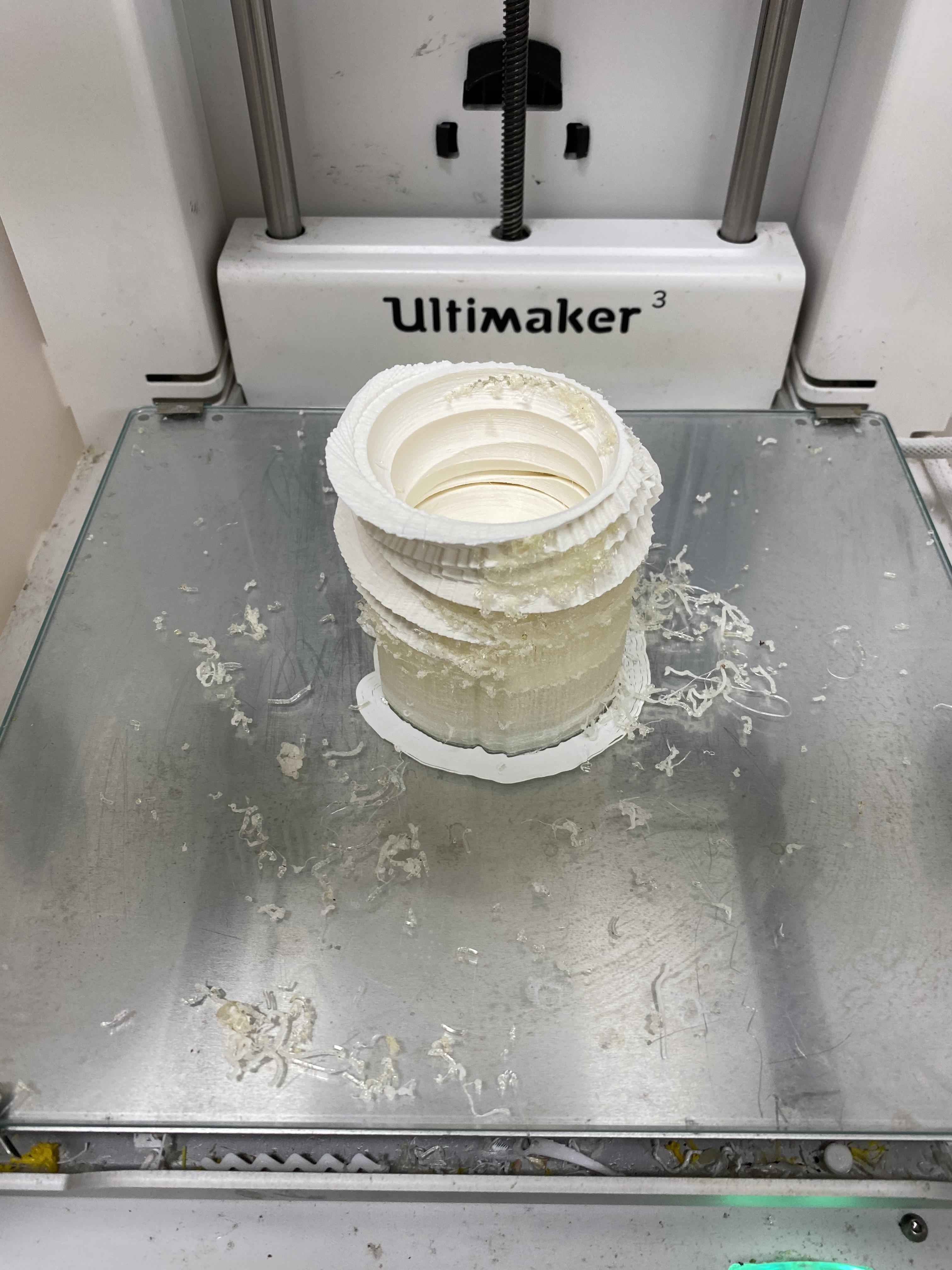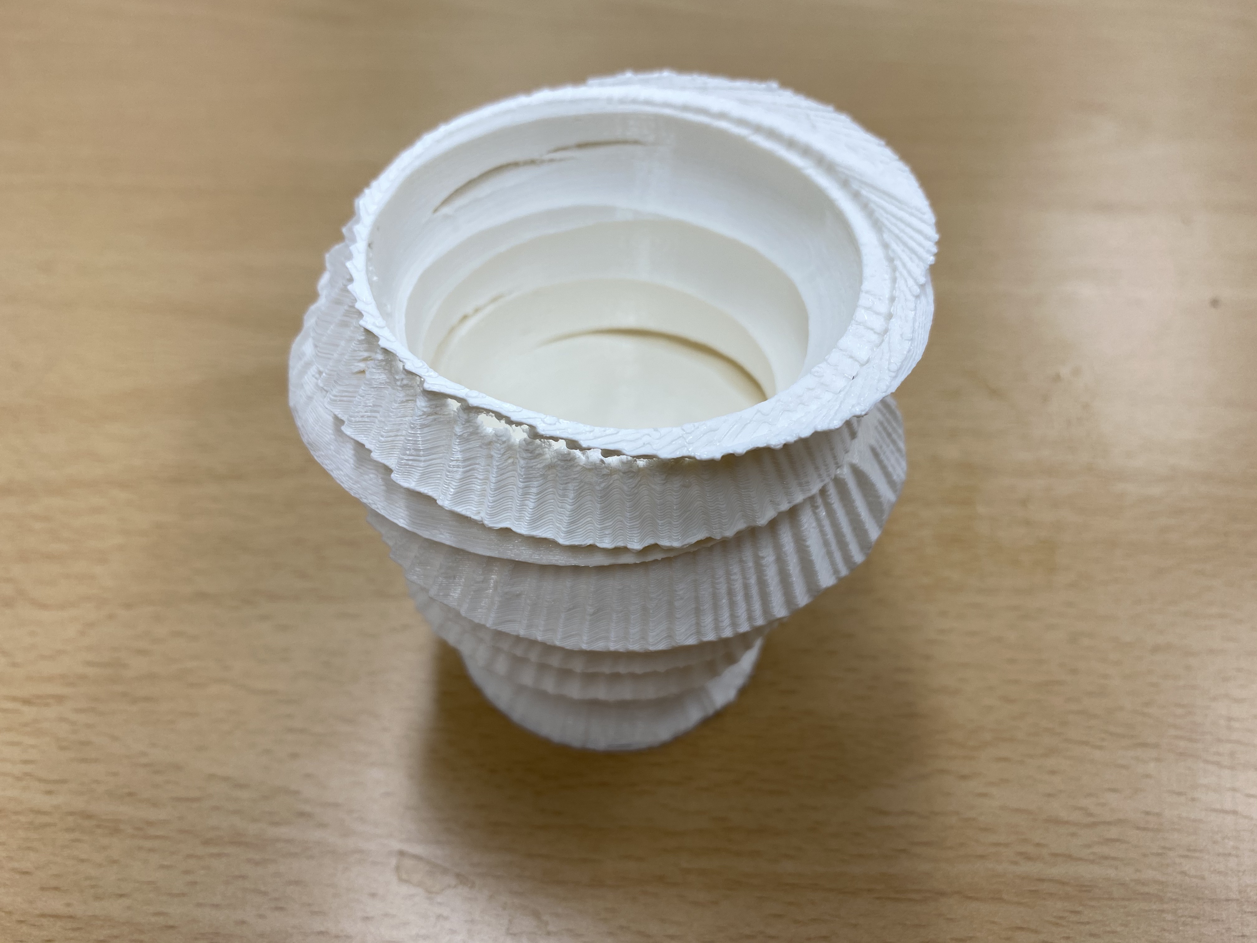 The image above shows just printed copy of a virtual pottery. It took more than 4 hours to print. The translucent part is made of soluble material which made possible to print overhang part of the pottery.