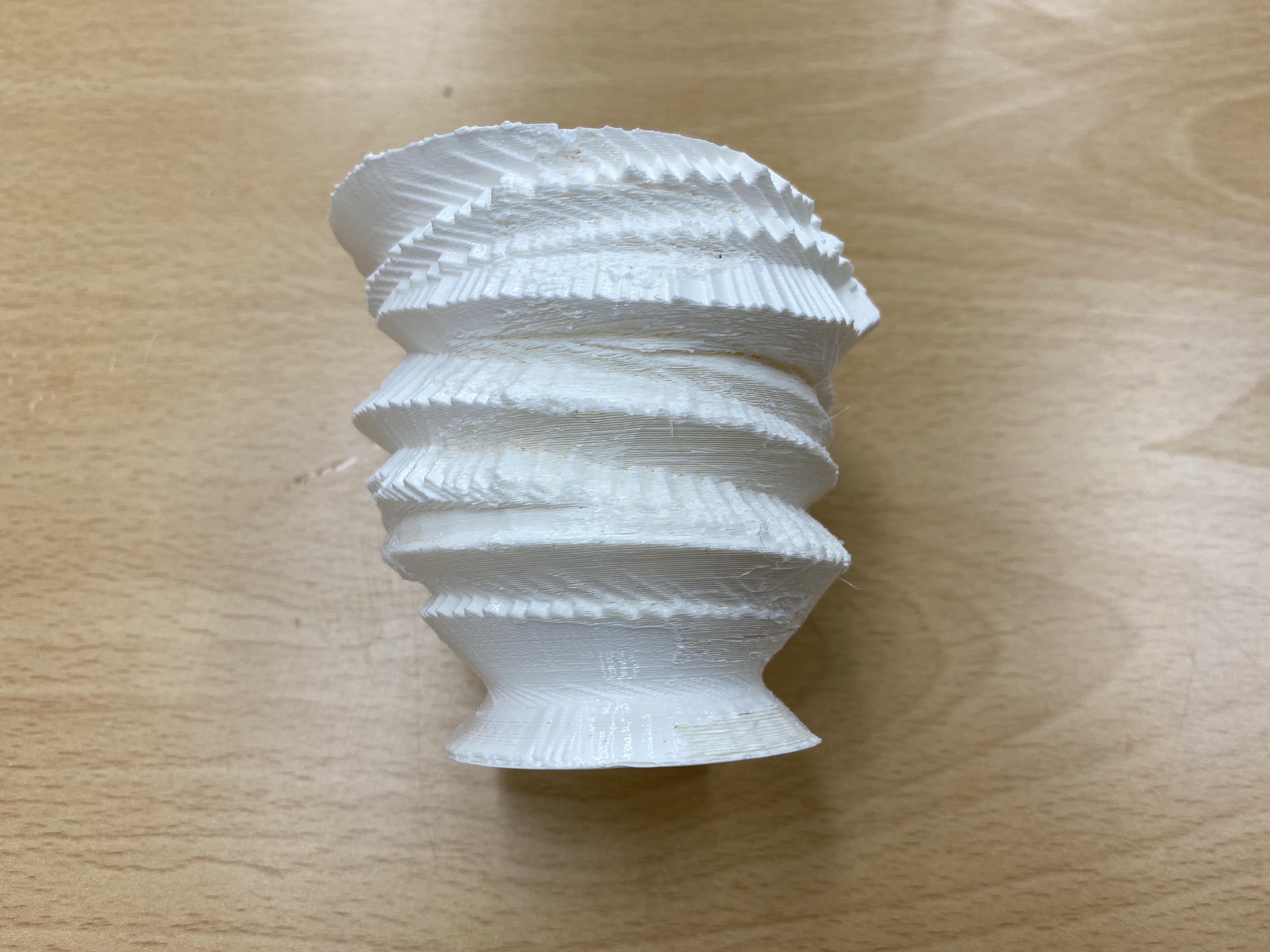 The image above shows just printed copy of a virtual pottery. It took more than 4 hours to print. The translucent part is made of soluble material which made possible to print overhang part of the pottery.
