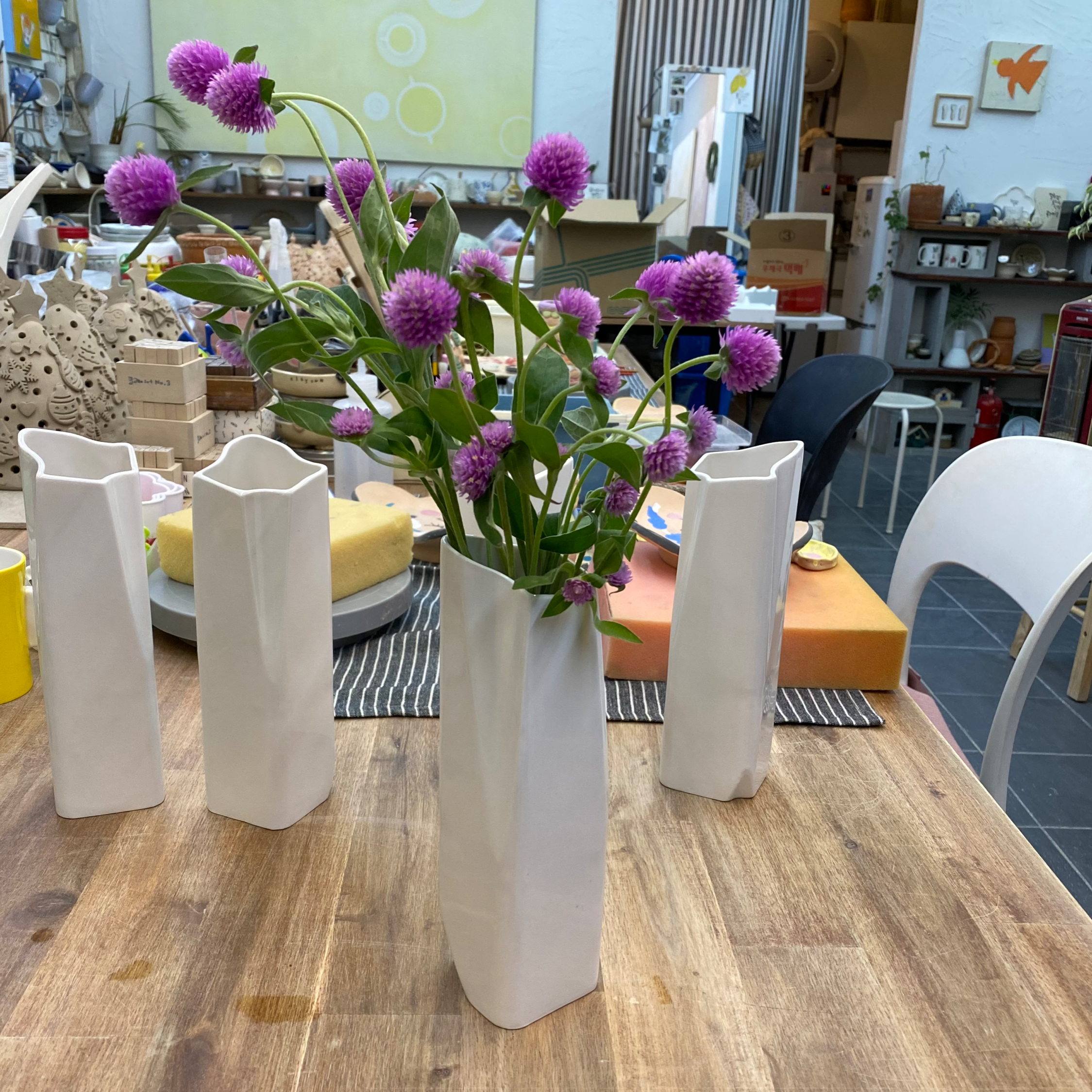 The shape of architecture transformed into a vase. The design motif of the M tower (tentative) was a vase, so there is no reason not to try to make vases with it. Luckily there was a pottery workshop just nearby my university. So I took a 3d printed model to a pottery workshop for collaboration. A gypsum mold was made with the model, and the vases were made through the slip casting process.