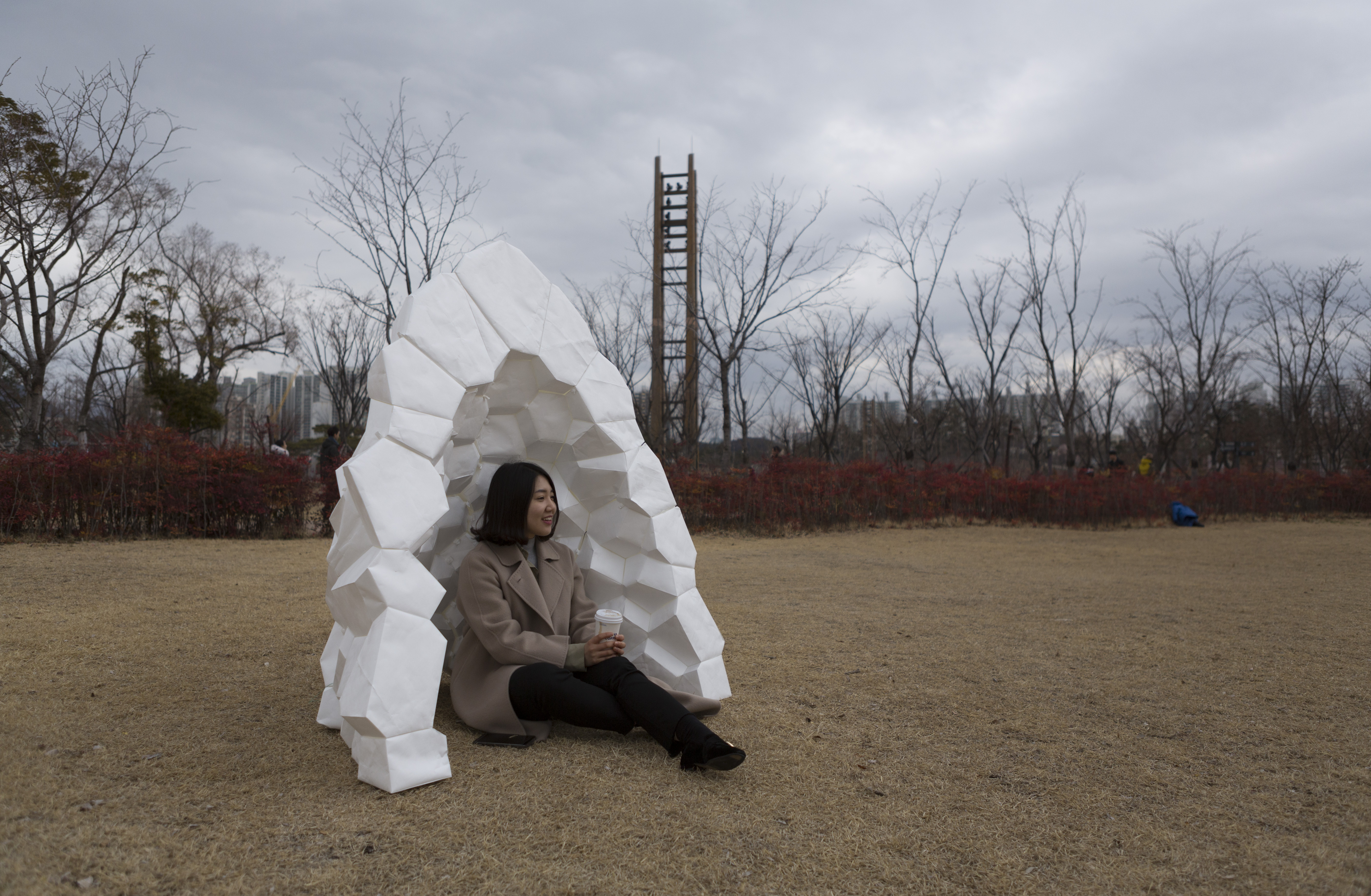It is a team project with my friend. We were seeking to build a light and heartwarming form which can create a personal zone in the outdoor environment. The material of the installation, Tyvek, my favorite, was chosen because it can resist outdoor conditions. The electronic components (An Arduino board, LED strips, and a distance sensor) were used to maximize warm feeling and add an interactive function. At that time, I was into playing with an Arduino board and its accessories for exploring new design possibilities, so it was a great chance to develop my ability more through practice.