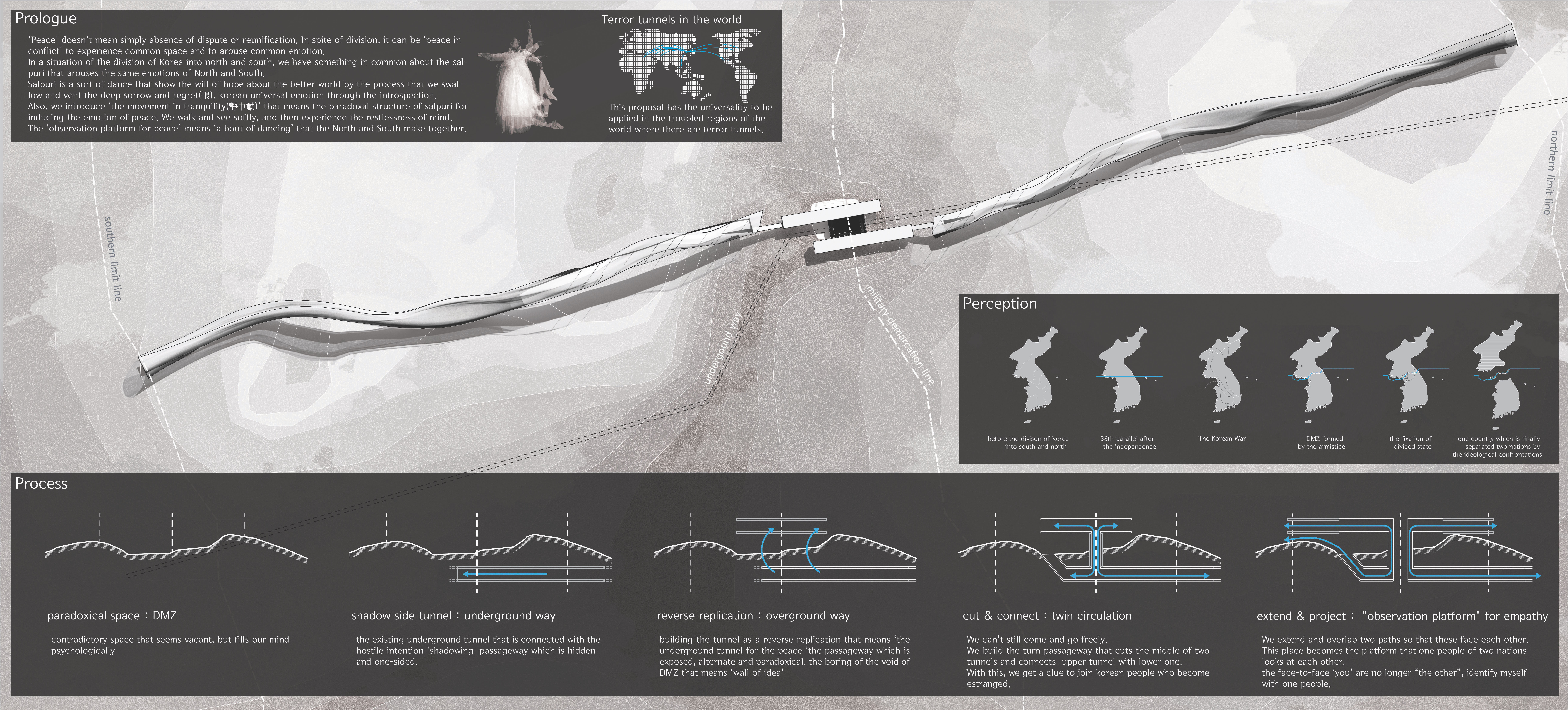 'Peace' doesn't mean simply absence of dispute or reunification. Inspite of division, it can be 'peace in conflict' to experient common space and to arouse common emotion. In a situation of the division of Korea into north and south, we have something in common about the salpuri that arouses the same emotions of North and South. Salpuri is a sort of dance that show the will of hope about the better world by the process that we swallow and vent the deep sorrow and regret(恨), korean universal emotion through the introspection. Also, we introduce ‘the movement in tranquility(靜中動)’ that means the paradoxal structure of salpuri for inducing the emotion of peace. We walk and see softly, and then experience the restlessness of mind. The ‘observation platform for peace’ means ‘a bout of dancing’ that the North and South make together.